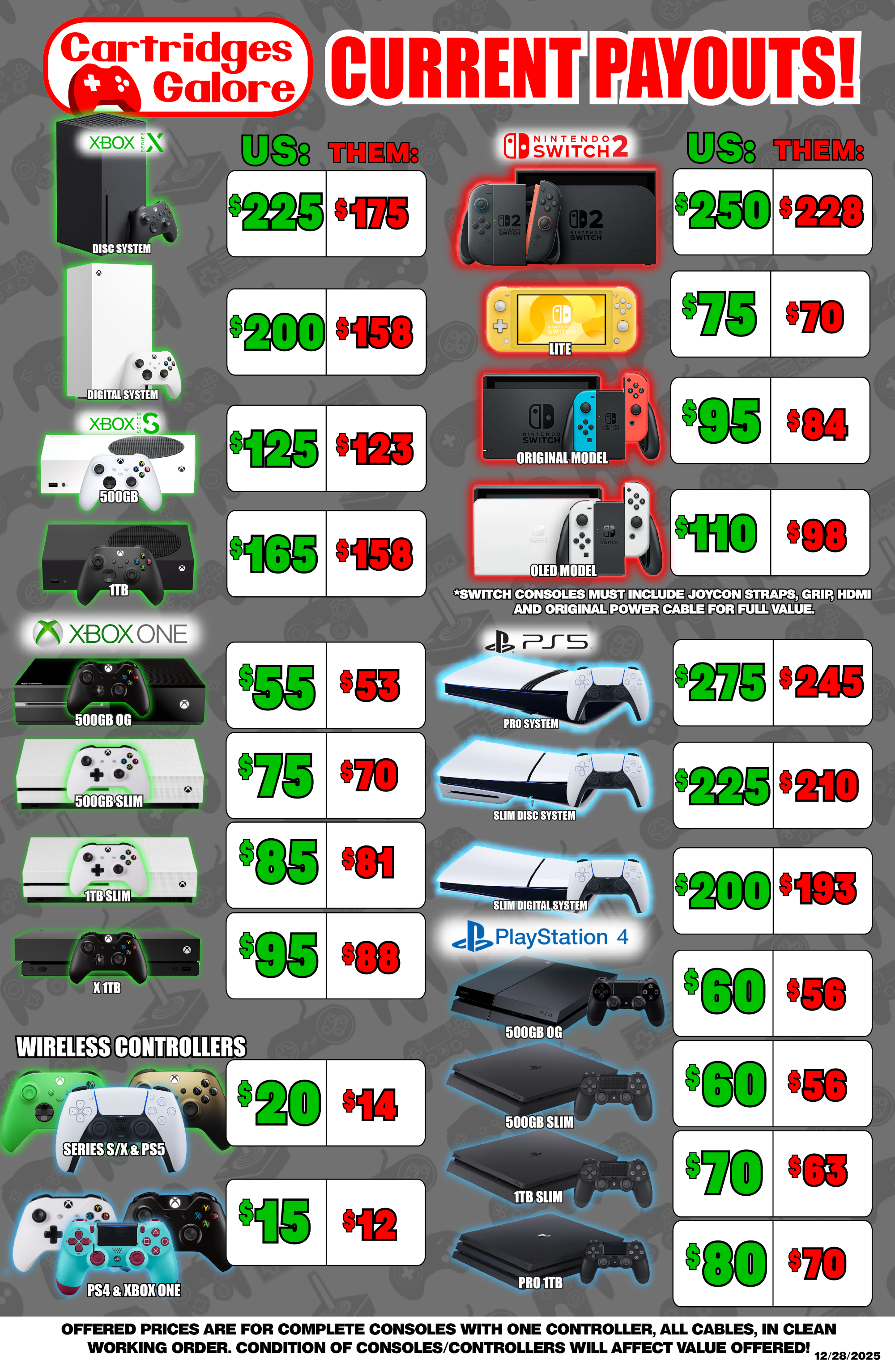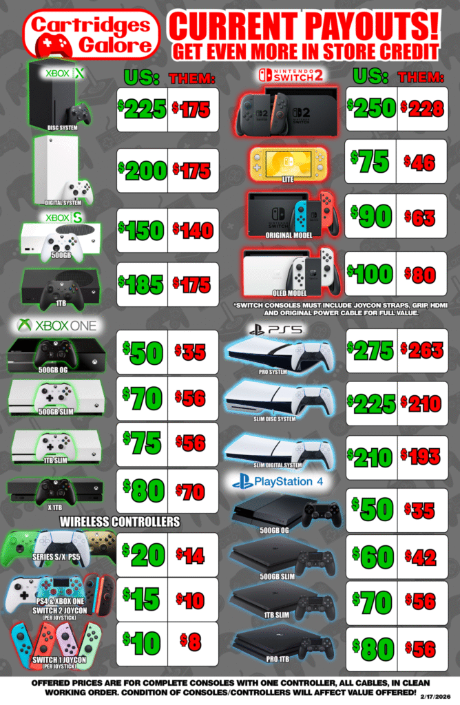 Trade in your used video games, consoles, memorabilia and accessories at Cartridges Galore and receive cash or credit towards more games, consoles, electronics, and gear!